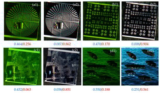 To further verify the robustness of the HMTS algorithm, more experiments are conducted on the diffractive images obtained from the third ground experiments with serious color deviation. In Figure 5, the HMTS algorithm is implemented to various resolution targets and image targets of ocean scenes and land scenes. The corresponding MDI and HOA of images are computed as well. By comparing the image before and after processing, one can see that the color of the diffractive images are well restored and the image visual effects are significantly improved. It is also noted that the HOAs increase and the MDIs decrease for all test images after implementing the HMTS algorithm. Considering all experimental images shown in Figure 4 and Figure 5 and taking the statistical averages of the color deviation indexes, it is found that the average MDI decreases from 0.349 to 0.037, and the average HOA increases from 0.154 to 0.776, after implementing the color restoration with HMTS. These indicate that the HMTS algorithm has good performance and strong robustness of color restoration for diffractive images of various scenes and targets.