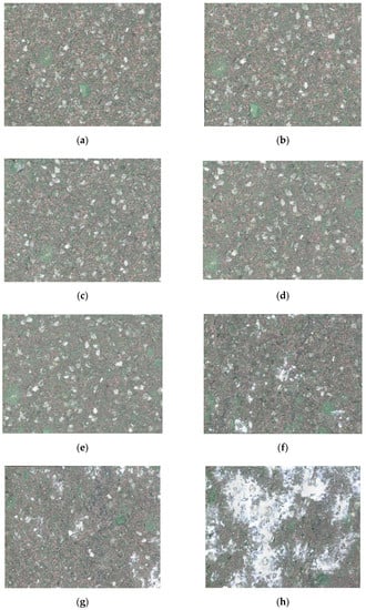 Wheel topography evolution during grinding. (a) the 1st node; (b) the 3rd node; (c) the 5th node; (d) the 9th node; (e) the 13th node; (f) the 15th node; (g) the 17th node; (h) the 19th node.