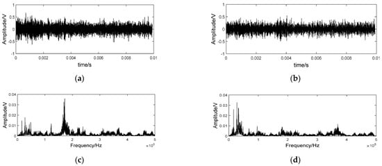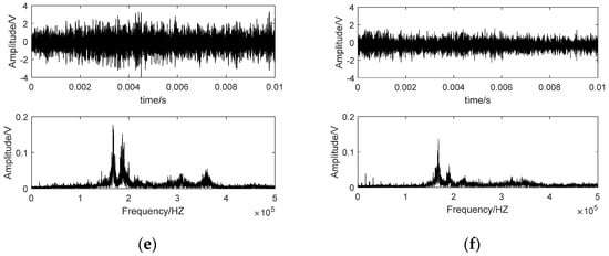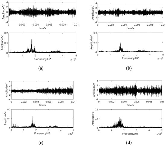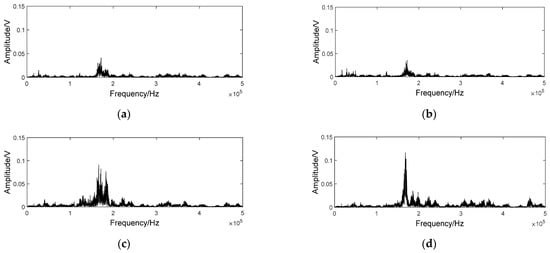 The visualization of intermediate layers clarified the performance of CNN. An AE sample of the 5th node was put into the trained model, and the outputs of the first two kernels of the first convolutional layer are shown in Figure 7a,b, respectively. They were random as the original input. It is hard to recognize the difference on time domain. Therefore, Fourier transform was used for further comparison. Spectrums of the two output signals are also shown in Figure 7c,d, respectively. The obvious difference in energy distribution manifests that the two kernels are focused on signal characteristics of different frequency domain. That is to say, characteristics of different AE components originally mixed in time domain were extracted and separated by diverse kernels. Therefore, more distinct changes can be recognized without the disturbance of other components. It is verified by comparing the outputs of some samples from different nodes as shown in Figure 8. With the deterioration of wheel condition, characteristics in frequency span 150–250 kHz were dramatically changed.