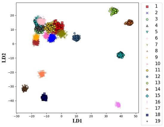 The generation mechanism determines the superposition and linear separability of AE signals of grinding brittle material. Therefore, LDA can be used to evaluate the variety of AE spectrums for all the observation nodes. Taking the order number of observation nodes as labels, spectrums of all AE samples were projected on a two-dimensional feature space by LDA as shown in Figure 4. AE samples belonging to a certain node are drawn with the same color and the same mark in the figure. Color and mark used for the nineteen nodes are listed in the figure legends. AE samples were chronologically acquired on the nineteen nodes during experiments and they were assigned into nineteen classes corresponding to various states of wheel condition. Samples from the same node are concentrated in a small local area because of their quite similar spectrum pattern. The distances between various classes manifested their differences. Classes corresponding similar wheel states are close or overlapped in the two-dimensional feature space. As shown in Figure 4, sample sets before the 12th node were tangled with each other in the projection. It manifested that the wheel state was relative stable before the time point of the 12th node. The subsequent nodes were all far away from the stable range, and moreover, there were distinct distances between them. Wheel state dramatically changed with the time elapse. The results coincide with the evolution of wheel topography discussed in the above section.