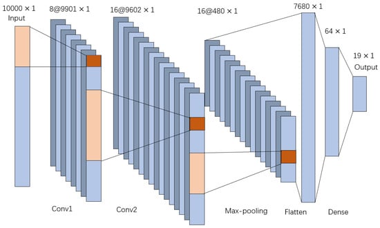 CNN is a kind of feedforward neural networks which contains convolution computation and has deep structure. It is one of the representative algorithms of deep learning. CNN is originally applied in image classification []. The existing literatures presented the successful application of CNN in residual life prediction and tool condition monitoring [,]. In order to directly transplant the model structure used in image tasks, the majority of them took time-frequency images or other two-dimensional data as the model input. CNN has the ability of representation learning and can shift invariant classification of input information according to its hierarchical structure, so it is also known as shift invariant artificial neural networks []. The advantage of CNN is coincided with the convolution form of AE signals during grinding brittle materials as mentioned in Section 2. Therefore, one-dimensional AE time waveform is taken as the input of CNN model in the paper. CNN integrates feature extraction and classification, and its deep network structure endows CNN with the capability of deconvolution of AE features mixed in time domain.