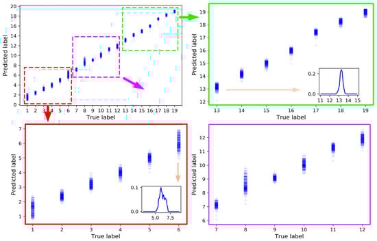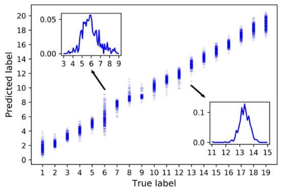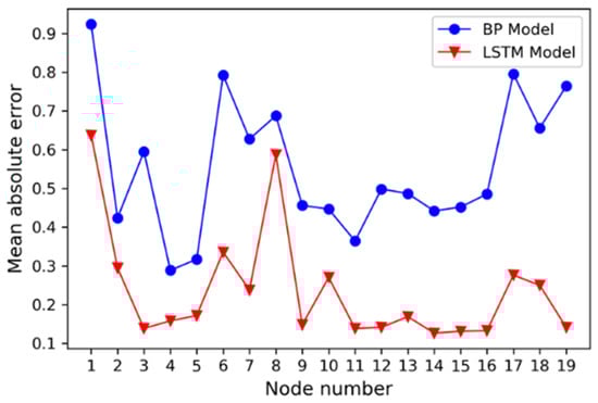 After 15 steps of training, the mean absolute error (MAE) of the training set converged to 0.0322, and the MSE converged to 0.1328. The MAE and MSE of the test set were 0.1055 and 0.2361, respectively. Additionally, the results on the test set are shown in Figure 10. The upper left picture is the integrated results for all the nineteen nodes. It was divided into three parts drawn in the other three pictures just for the sake of clarity. The predicted label was continuous value for regression. Except the 1st and the 8th nodes, the predicted labels of samples on the other nodes were concentrated on the true label value. For further comparison, the probability density function of predicted label of the 6th and 13th nodes are also displayed on the blank of the pictures. As shown in Figure 10, the accuracy of the models is relatively low at the 6th node and relatively high at the 13th node. The result of the corresponding optimal traditional BPNN network in the test set after 1000 steps of training are shown in Figure 11, and the corresponding MAE and MSE were 0.5345 and 0.4807, respectively. The probability density function of predicted label by the BPNN network of the 6th and 13th nodes are also displayed in Figure 11. The MSE of the LSTM network model was reduced by 78.1% and the MAE was reduced by 50.9% compared with the BPNN model. The sub-node test errors of the two models are shown in Figure 12. The performance of LSTM was better than BPNN on all nodes. Additionally, there were low MAE except the 1st node and the 8th node.
