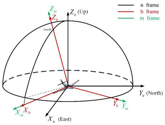 The n-frame: The navigation coordinate frame selects the geographic coordinate frame (E-N-U coordinate frame). The origin is the vehicle’s center of gravity. The -axis, -axis, and -axis point towards the geography of East, North, and Upward to the Earth’s surface.