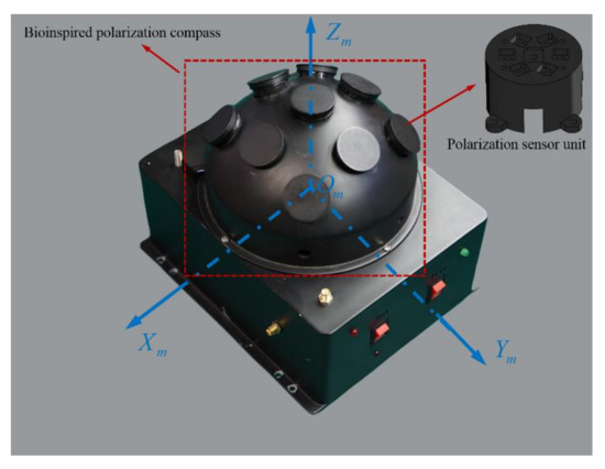 The m-frame: The bioinspired polarization compass coordinate frame is defined as the mounting position of the polarization sensor units relative to the body frame. Its origin is at the center of the bioinspired polarization compass. The -axis is aligned with the observation direction of the middle polarization sensor units. The -axis points to the zero-position direction of the middle polarization sensor units. The -axis satisfies the righthand rule (Figure 2).