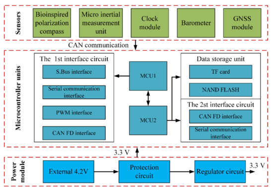 The hardware structure of the integrated system includes microcontroller units, micro inertial measurement units, bioinspired polarization compass, and GNSS module, etc. Two 32-bit ARM cortex-M7 chips (ATSAMV71Q20) as microcontroller units (MCU) are used to process the polarization information and other navigation information. The STIM300 SINS contains three high accurate advanced micro-electromechanical systems (MEMS) gyroscopes (ADXRS642) and three high-performance accelerometers (ADXL202). The GPS receiver module (NEO-6M) is used to provide the initial position information as well as the “ground truth” to evaluate the positioning performance of the proposed integrated system. The integrated system model is communicated with the computer via a data transceiver (HC-12). The block diagram of the integrated system is shown in Figure 3, and the hardware structure is shown in Figure 4. The parameters of the sensors are listed in Table 1.