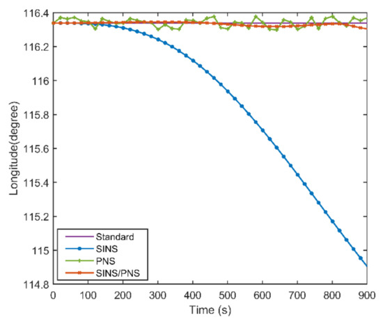 Figure 8 and Figure 9 illustrate the longitude comparison among the SINS/PNS integrated system model (the red curve), the SINS model (the blue curve), and the PNS model (the green curve) [23]. Figure 8 shows that the longitude obtained by the PNS model and the SINS/PNS integrated system model can track the purple reference curve. During the test, the longitude obtained from the proposed model varies from 116.339 to 116.304°, and that obtained from the PNS model varies from 116.378 to 116.299°. The SINS model has the worst performance among the three models. The longitude of the SINS model varies from 116.339 to 114.903°. From Figure 9, we can see that when the test time is less than 200 s, the three models can achieve almost the same longitude calculation accuracy. The longitude errors of the SINS become more significant and have a clear divergent trend after 200 s. The longitude errors of the SINS are larger than 1.4° during the test. Whereas, the longitude errors of the SINS/PNS integrated system model remain stable and maintain a converged state. The longitude errors of the SINS/PNS integrated system model are less than 0.04°. The longitude errors of the PNS model fluctuate continuously, and the errors are larger than the SINS/PNS integrated system model.