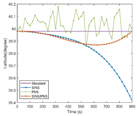 Figure 10 and Figure 11 show the latitude comparison among the SINS/PNS integrated system model (the red curve), the SINS model (the blue curve), and the PNS model (the green curve). From Figure 10, we can see that the latitude calculated based on the SINS model has a clear divergent trend compared with the purple reference curve. The latitude of the SINS model varies from 39.979 to 39.411°. However, the SINS/PNS integrated system model and the PNS model have better performance than the SINS model. During the test, the latitude of the SINS/PNS integrated system model varies from 39.981 to 39.868°, and the PNS model varies from 40.062 to 39.917°. Figure 11 shows that the latitude errors of the SINS increase with time; which vary from 0 to 0.568°. In comparison, the latitude errors of the SINS/PNS integrated system model have a converging trend. The latitude errors of the SINS/PNS integrated system model varies from 0 to 0.034°. The latitude errors of the PNS model fluctuate continuously, and the errors are larger than the SINS/PNS integrated system model.