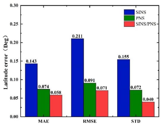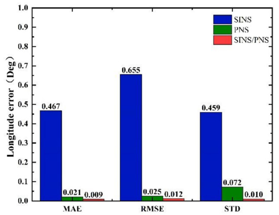 From Figure 12, we can see that the MAE, RMSE, and STD of latitude errors derived from the SINS/PNS integrated system model are 0.058, 0.071, and 0.04°, respectively. Compared to that derived from the SINS model, the errors are reduced by 59.4%, 66.4%, and 74.2%, respectively. Compared to that derived from the PNS model, the errors are reduced by 21.6%, 22.0%, and 44.4%, respectively. Similarly, as can be seen from Figure 13, the MAE, RMSE, and STD of longitude errors derived from the SINS/PNS integrated system model are 0.009, 0.012, and 0.01°, respectively. Compared to that derived from the SINS model, the errors are reduced by 98.1%, 98.2%, and 97.8%, respectively. Compared to that derived from the PNS model, the errors are reduced by 57.1%, 52.0%, and 86.1%, respectively.