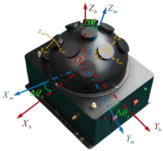 The installation errors of the system include the initial installation errors between the bioinspired polarization compass and the b-frame and the initial installation errors among each polarization sensor unit. The installation errors can be described as shown in Figure 14. Under optimal conditions, the m-frame of the bioinspired polarization compass is aligned with the b-frame of the system. However, due to the uncertainty of reference direction and manufacturing defects, the installation errors cannot be avoided. Hence, the E-vectors observed by the polarization sensors are not accurate, and the errors will be passed to the sun elevation calculation. Concerning the installation error analysis and calibration of the system, we have established the calibration model and estimated the installation errors in our works. The calibration results are listed in Table 2. The comparison of the sun elevation before and after calibration is shown in Figure 15.