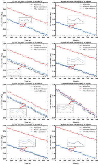 Comparison of the sun elevation before and after calibration. (a–h) The comparison of the sun elevation before and after calibration calculated by the and polarization sensor units.