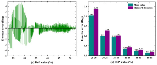 The relationship between the DoP and E-vector error. (a) The distribution of the E-vector error in different DoP values; (b) the statistical characteristics of the E-vector error in different DoP values.