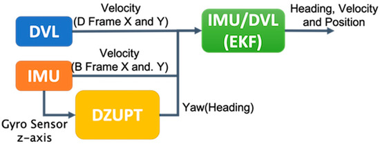 Marine DVLs perform well in shallow water. Here, a four-beam DVL sonar, installed under the ship, measures the lateral and longitudinal velocities of the ship by transmitting and receiving sonar [15]. Only a few papers have discussed IMU/DVL coupling, which is used for autonomous underwater vehicle (AUV) navigation. AUV navigation is suitable for navigation along a predetermined fixed path [16]. However, to comply with local traffic center control and avoid collisions with other ships, vessels often cannot follow routing plans in the offshore area. Li et al. combined an IMU and 300 kHz DVL navigation using the least squares method [6]. By initial precise attitude alignment and ring-laser gyroscope, an experimental ship can sail 44 km in a river, with an error of 60 m.