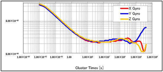 In this section, the results of the two methods are summarized and briefly discussed. The first method used only the yaw-rate gyroscope of the IMU and DVL for 1 h dead-reckoning. The horizontal position error increased up to 943 m in a 1 h sailing duration. Here, two important points should be considered. The first is to estimate the initial direction at the beginning of the test. The GNSS-derived direction can be used for this purpose if the slip angle of the vessel is very small. The second is to estimate the temporal bias of the yaw-rate angle. This is very important in the use of IMUs because the sensor output drifts easily. Although temperature correction is also important, we did not correct the effect of the change in temperature because the largest difference in temperature in this test was 1°. In general, the temperature of the IMU inside a ship is not difficult to maintain. In summary, a cumulative horizontal error of approximately 1000 m per hour was achieved using only a low-cost IMU and the vessel’s standard DVL, even with several 90°–180° turns. This means that we could navigate the vessel without GNSS, due to spoofing or interference attacks for example, for 1 h with an accuracy of approximately 1000 m. The second method used three accelerometers and three gyroscopes of the IMU with the DVL. The approach of the second method differed from that of the first simple method in the following ways. First, the parameters of the AV for the target IMU were investigated thoroughly. Based on these estimated parameters, INS/DVL integration was conducted using EKF. The horizontal position error increased up to 579 m in the 1-h sailing duration. The accumulated error was reduced because all parameters and outputs of the IMU were used to estimate the direction and attitude of the vessel.