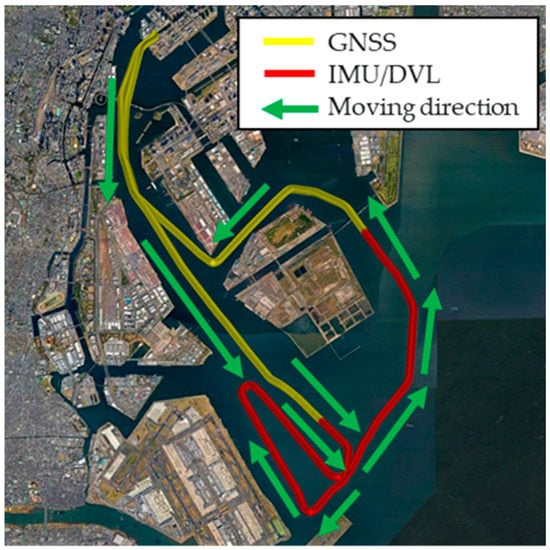 Table 3 summarizes the sensor information used in this experiment. The IMU was the CSG-MG100, manufactured by Tokyo Aircraft Instrument Co., Ltd, Tokyo, Japan. and equipped with a time-synchronization function with GNSS. This IMU can detect three-axis acceleration and three-axis angular velocity. During the experiment, the IMU was installed with the bow direction along the X-axis, the starboard direction perpendicular to it as the Y-axis, and the vertically downward direction as the Z-axis. The four-beam DVL ATLAS DOLOG SYSTEM was installed on the bottom of the ship in front of the vessel bow thruster. In the fore-aft and lateral directions, the DVL can obtain ground speeds for up to 200 m depths. For this experiment, we set the DVL error at 0.2% of the measured value.