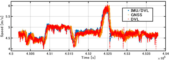 As shown in Figure 9, when the GNSS velocity, the speed obtained by integrating the acceleration of the IMU (hereinafter referred to as the IMU speed), and the DVL speed are compared, the accuracy of the IMU speed deteriorates with the increase in bias. Because the acceleration includes gravitational acceleration, it is difficult to estimate the bias with DZUPT, due to the vertical movement of the vessel. Even if DZUPT can be applied, the instability errors of the bias and velocity cannot be fully removed. DVL and GNSS velocity values are generally equal, but the speed of DVL includes some jumps. These jump values appear as large error factors in position estimation. The cause of the jump is generally considered to be the effect of hull sway and air bubbles, but the specific cause is unknown. To confirm this error in detail, as shown in Figure 10, the error was calculated by subtracting the GNSS speed (RMC output from NMEA) from the sonar speed. The STD was 0.11 m/s, and the maximum error was about 0.8 m/s. As a result of constructing a speed estimation KF using this STD, the noise of the DVL is generally smoothed; however, the accuracy is lower than that of GNSS or DVL alone at approximately 452,500 s. The STD of the error in IMU/DVL was 0.09 m/s, and the maximum error was 0.53 m/s, which was better than the result of the DVL alone.
