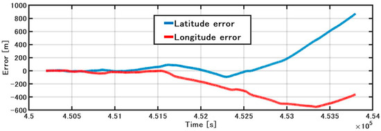 Figure 11 shows the position error of the IMU/DVL dead-reckoning. The attitude error changed slightly during ship turning and increased at the point when the vessel finished the turn and went straight, with a final latitude error of 873 m. Initially, the longitude error increased slowly and finally reached −357 m. Due to the ship-steering operation, the vessel had a different force and error model at the different heading. This is why the latitude and longitude errors sometimes increased and sometimes decreased. In addition, we investigated the position error with rough slip-angle correction for large turns. The final latitude error was reduced from 873 m to 851 m, and the final longitude error was reduced from −357 m to −314 m. These results indicate a need for further investigation of slip-angle errors in the future.