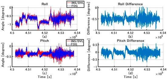 (a) Roll angle of INS/DVL and FOG; (b) Roll difference between INS/DVL and FOG; (c) Pitch angle of INS/DVL and FOG; (d) Pitch difference between INS/DVL and FOG.