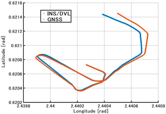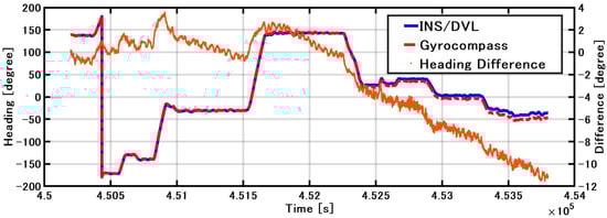 The roll and pitch outputs of INS/DVL and FOG and the differences in each output between them are shown in Figure 12. The difference between the FOG and INS/DVL pitch angle was 0.62° to −0.69°. By contrast, the difference in roll angle between the INS/DVL and FOG was 1.1° to −0.9°. Figure 12c shows that the INS/DVL had a poor response to small angle variations. We found that the drift in roll and pitch can be suppressed using a complementary filter for the sea conditions experienced during this experiment. The heading output of the INS/DVL and gyrocompass and the differences between them are shown in Figure 13. The heading error increased throughout the experiment to a maximum of −11.10°, which is a factor that affected the final position error described below. The heading error did not increase initially until about 4.515 × 105 s. We think this is because the bias was removed by turning nearly 360°. Figure 13 shows that the difference increased exponentially when turning, and increased at a constant rate when going straight. For this difference, we can create a detailed sensor-error model, estimating the error when GNSS is available, performing the same process as DZUPT when the vessel is moving straight ahead, or estimating the error using the gyrocompass. In the future, we intend to study a method of bias estimation according to the available equipment.
