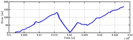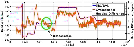 Figure 15 shows the position estimated by the INS/DVL and RTK-GNSS. Figure 16 shows the horizontal position difference between INS/DVL and RTK-GNSS. Figure 16 shows that the horizontal error was reduced because the angular velocity bias around the Z-axis was canceled out by the approximately 360° turn at around 4.52 × 105 [s]. Subsequently, the position estimation error increased as well as the effect of the heading error shown in Figure 13, and the final error was 579 m. In this study, we used a gyrocompass as a reference. If we use the gyrocompass values to estimate the heading bias in the circled area in Figure 17 and then correct for the heading bias, we obtain the result in Figure 18, where the final horizontal error is 170 m. This post-processing method was only applied to the results of Figure 13 found to contain bias and is, therefore, not applicable as a real-time bias detection and correction method at this time.
