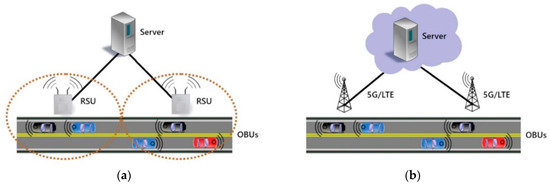 Examples of VANET configurations: (a) VANET with RSUs; (b) VANET with cloud.