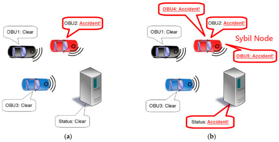 Example of greedy driver attack: (a) Failed attempt using a single vote; (b) Successful attempt using Sybil attack to create additional votes.
