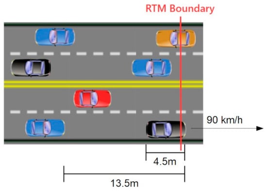 Consider a relatively busy city highway with traffic moving at 90 km per hour or 25 m per second. Assume an average vehicle length of 4.5 m and a separation of two vehicle lengths for 13.5 m total per vehicle interval, including the vehicle’s own length and the buffer. (Shown in Figure 5) Under those conditions, even if we only consider a single lane of traffic, at that moderate speed one vehicle will leave the group every 0.54 s. If the traffic travels in two lanes in both directions, for a total of four lanes, one vehicle will cross an RTM boundary every 0.135 s.
