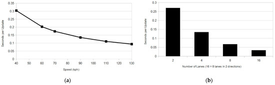 Seconds between key updates due to departing OBUs: (a) Single lane of traffic at various speeds; (b) Traffic moving at 90 kph.