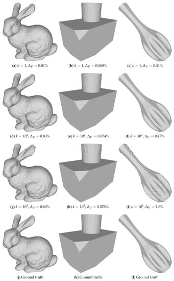 In Figure 1, we show how our method was able to reconstruct the Stanford Bunny starting from a sphere. The reconstruction was done for . After finishing the optimization based on Equation (9), we remeshed the result by halving the target edge length ℓ from the last remeshing step to get a mesh with an even finer resolution. The two in-progress images shown are during the initial optimization directly on . The final reconstruction contained many of the fine details of the true bunny (Figure 3j).