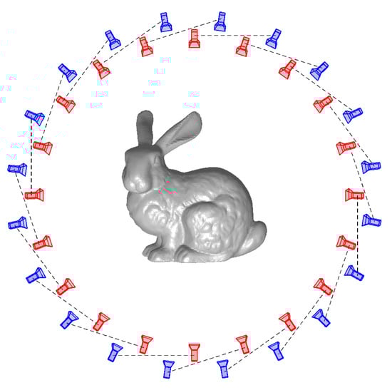 where is the largest diagonal of the bounding box of the current mesh. To be able to solve the problem in Equation (9), we estimated using the heterodyne principle [33]. In all our experiments, we used 60 camera–projector positions organized in three circles, with 20 cameras in each circle, to mimic a structured light scanner with the object placed in three different poses on a turntable rotating 18° between each image. One of these circles is visualized in Figure 4. The camera resolution for all renderings was pixels. Our method used approximately 1 s per iteration depending on the number of vertices and the resolution of the images.