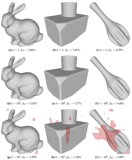 Poisson reconstructions of three different objects, for increasing levels of noise k. The reconstructions for had a lower than the reconstructions at lower noise levels, as these reconstructions were done at an increased octree depth to ensure that the reconstructions had more vertices than the corresponding reconstructions in Figure 3. Red areas do not belong to the largest connected component and have thus not been used in the computation of .
