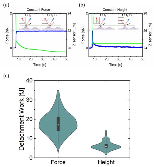 Furthermore, the impact of two different delay modes, constant-force and constant-height, was also investigated (Figure 3). The cell probe was lowered and retracted at a constant speed of 10.0 μm/s and kept in contact with the target cell for 45 s after the preset force of 1.0 nN was reached. The vertical deflection variation as well as the relative piezo displacement over the time for the two selected delay modes are reported in Figure 3a,b. The results show that, when the setpoint force is kept constant (Figure 3a, blue line) during all the time the cells are in contact, the relative piezo displacement (Figure 3a, green line) decreases due to the dynamic rearrangement of the cells able to remodel their structure when subjected to an external force. On the other hand, when the constant height mode was employed (Figure 3b), after an initial and rapid increase of the vertical deflection to reach the setpoint force of 1.0 nN, the force decreases settling down to lower values (Figure 3b, blue line) being the height to be kept constant as shown by the relative piezo displacement signal (Figure 3b, green line). The distribution of the detachment work while using these two modes is presented in Figure 3c. Results reveal that work needed to detach both cells in the case of constant-force mode is significantly higher than in the case of constant height mode and higher forces are associated with broader distributions.