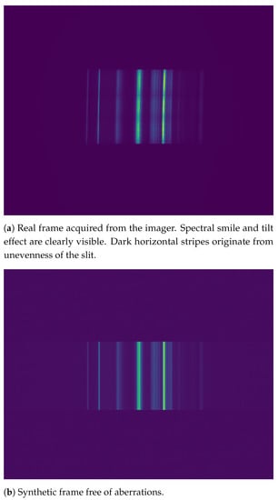 Spectral smile is an aberration that causes the emission lines to have a curved shape. It is caused by dispersion when the slit image is spread over the sensor []. Figure 2 shows an example of a raw, uncorrected frame acquired from our imager side by side with an ideal synthetic frame that is free of aberrations. In addition, the well-known keystone aberration is barely visible in the real frame. It causes the emission lines to shorten towards the red end (right-hand side in the figure) of the spectrum. Tilt and smile aberrations are more easily distinguishable in figures in Section 3.