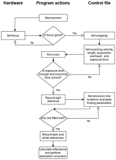 Preview is used to adjust the focus of the imager and cropping the raw sensor image to illuminated area. Scanning length and velocity can be given in arbitrary units, such as mm/s and mm, respectively. Acquisition overhead and exposure time affect how much time is allocated to acquire each frame and thus, the total frame count of the scan. The actual scanning time may differ if the imager cannot provide frames at requested rate, in which case the parameters need to be adjusted by increasing acquisition overhead or decreasing scanning velocity. Next, emission line location estimates and parameters for peak finding algorithm are given. After recording dark and white reference frames, aberration corrected reflectance image can be calculated.