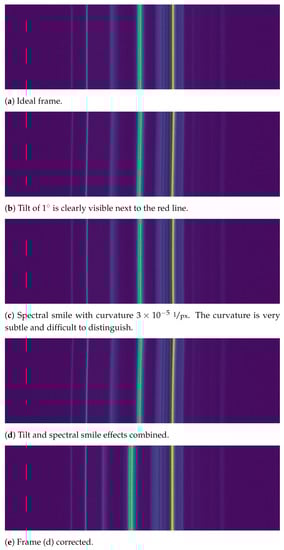 Comparing the ideal frame in Figure 5a with corrected frame in Figure 5e shows that our method corrects the tilt and spectral smile to imperceptible levels. The emission lines are shifted out of the original locations, as expected. Statistical results in Table 1 show that, on average, the tilt was reduced from  to , and spectral smile from  to . The uncorrected values in the table show the tilt is underestimated compared to the  tilt used in the generation process.