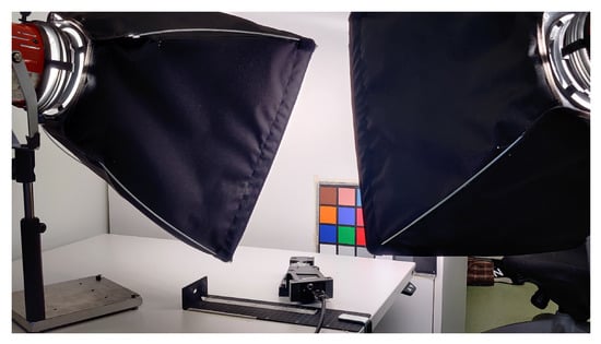 In the color checker experiment, a Macbeth color checker (ColorChecker Classic, X-Rite) was selected as a test target. It was taped onto the side of an office locker along with a four-fold strip of common copy paper as a white reference target. The imager was placed on an office desk against a metallic ruler fastened to the desk with a clamp and some tape. Instead of using a motorized scanning platform, the imager was slid along the ruler by hand. Distance from the front lens to the target was approximately 30 cm, while the length of the scan was 14 cm. From that distance the imager could cover the squares and some of their black boundaries in across scan direction. Imaged area consisted of the red, green, and blue color tiles (4 cm × 4 cm each). 798 frames with 110 ms exposure time were recorded. Cropping was set to 2000 pixels in spectral dimension and 800 pixels in along slit direction. The scene was illuminated by two halogen lamps with a diffuser. The lamps were set above the imager on both sides, and they were immobile relative to the target. The experiment setup is shown in Figure 6.