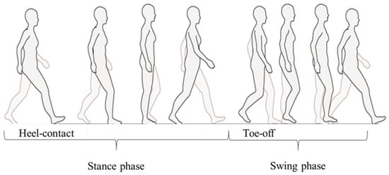 Gait can be classified into two phases: stance and swing. As shown in Figure 1, foot-contact and foot-off states during the gait cycle are defined as the stance phase and swing phase, respectively []. In the stance phase, the foot-contact posture changes according to heel contact, foot flat, and heel off. The swing phase starts with toe-off and ends with heel contact. A camera system is used as the gold standard method to detect foot-contact or foot-off states []. However, the system cannot be used outdoors for gait phase detection because of the lack of portability. This is crucial for widespread daily use. Therefore, wearable sensors for the classification of gait phases have been proposed for monitoring human gait motions in daily life.