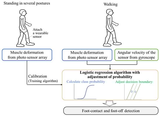 In this section, we present a detection system for foot-contact/foot-off based on LR, the probability of which is adjusted using the leg kinematic information with static standing-based calibration using muscle deformation information. Figure 2 depicts an overview of the system. The details of the sensor and classification algorithm are explained in the next subsections.