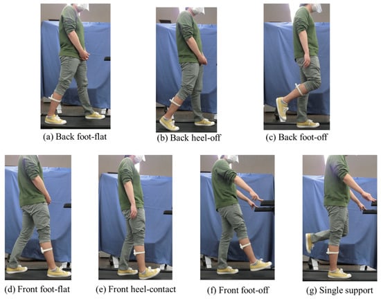 We first obtained muscle deformation data using FirstVR attached to the center of the right lower leg in the long axis direction, to be used as training data. The subjects were asked to assume seven postures, as shown in Figure 4, in terms of foot position (backside or front-side) and foot-contact state. We guided the subjects to stand in these postures by demonstrating them ourselves. Thereafter, we measured walking data on a treadmill for system evaluation. We recorded videos obtained from the right side of the body as well as muscle deformation data with FirstVR. In addition, the quaternion and angular velocity of FirstVR were measured by its installed magnetometric and gyroscope sensors. The sampling frequencies of the camera and FirstVR systems were 120 and 50 Hz, respectively. The video and FirstVR system were synchronized by videotaping the FirstVR connection interface at the start of the measurement. The subjects walked at their preferred speed ( km/h) on the treadmill for approximately 1 min, and 30 gait cycle data were extracted. In total, 19,651 frames were used for the evaluation.