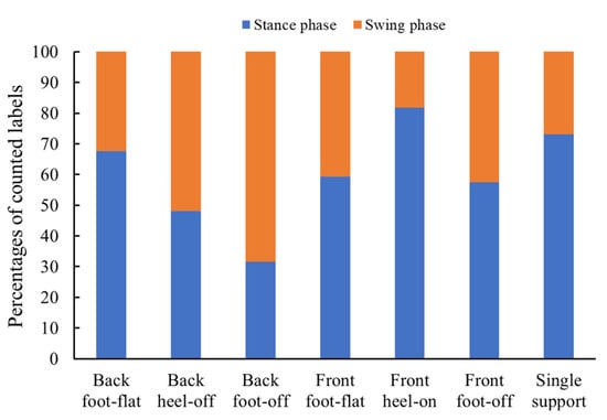 Figure 5 shows the percentages of labels whose muscle deformation vectors were closest to those of each posture in each gait cycle. The muscle deformation data of back foot-flat were the most similar to the data of the swing phase. Although front foot-off is a swing-phase posture, the percentage of stance phase was higher than for swing phase. The percentage of the stance phase was in the descending order of: front heel-on, single support, back foot-flat, front foot-flat, and back heel-off among the stance phase postures. The training standing data were included in order of Euclidean distance from the walking data of the stance or swing phases as training data combinations, as shown in Table 1.