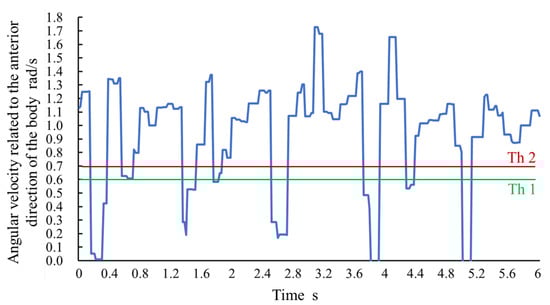 LR, SVM with tuned hyperparameters, and LR-a (adjusted LR using angular velocity data) were used as the detection algorithm. These algorithms were implemented in Python using a scikit-learn library. The LR solver was newton-cg and the other hyperparameters were the default. The best C value of SVM, which is related to penalty weight, was selected among 1, 10, 100, and 1000; and the best value of SVM, which is related to scale of the data space, was selected among 0.0001, 0.001, 0.01, and 0.1 for each person. Other hyperparameters of the SVM were left as default. The adjustment parameter a of Equation (4) was considered to range from 0 to 10, and 8 was used because it resulted in the highest accuracy. Figure 6 shows the angular velocity related to the anterior direction of the body during walking. We set thresholds Th2 and Th1 as 0.7 and 0.6, respectively, based on the angular velocity value during static standing. In the case where the attachment orientation of the sensor was upside down for some subjects, the angular velocity value was multiplied by −1. Because a large error of transformation (especially tangent calculation) causes a fault in the probability adjustment, the angular velocity values were unreliable when was significantly high. In this study, the adjustment was not performed if the maximum was more than 50.
