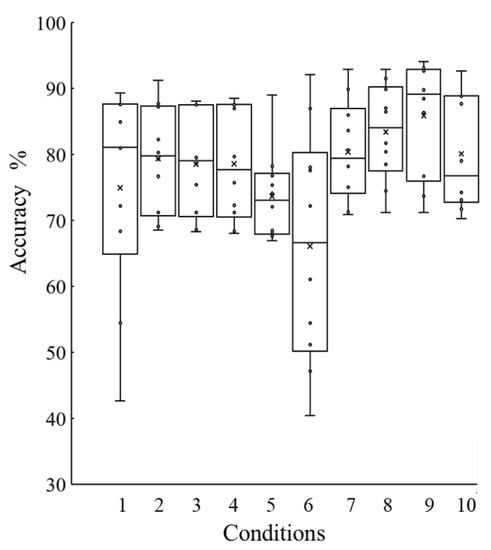 Figure 7 shows the accuracy produced by SVM for each training data combination explained in Table 1. The Kruskal-Wallis test showed that the differences in the training data combinations produced significant differences in detection accuracy. Notably, samples of conditions 6 and 9 were significantly different.