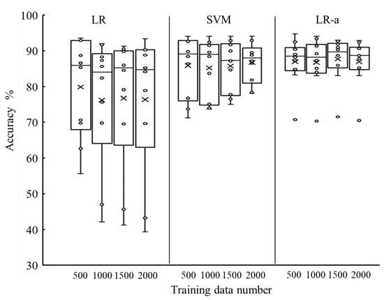 Box plot of accuracy when using logistic regression (LR) (left), support vector machine (SVM) (middle), and adjusted LR (LR-a) (right) with 500, 1000, 1500, and 2000 training data for each posture. Circle indicates accuracy for each participant, and x indicates mean value.
