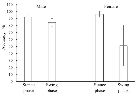 We observed individual differences in the detection accuracy. In particular, the accuracy for the female subjects tended to be lower, as shown in Figure 10. However, for the six male subjects whose muscle state was easily observed by the sensor, the gait phase could be classified into the stance and swing phases with higher accuracy (approximately 94% and 86%, respectively) only with muscle deformation data. As the stance phase and swing phase durations were approximately 0.7 and 0.4 s for male subjects, respectively, the error was approximately 0.05 s for the stance and swing phases. This accuracy is similar to that reported by some previous studies [,], where the calibration was performed using gait data as teaching data. Our proposed method could provide highly accurate gait phase detection if the values regarding muscle deformation are obtained clearly by the sensor.