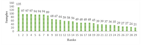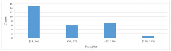Sample information is shown in Table 1. It can be seen from this table that the number of samples is not balanced. Some classes have more samples, reaching 135, while others have fewer samples, only 21. The sample numbers within the class are sorted from high to low to form a column chart, as shown in Figure 2, and the distribution histogram is shown in Figure 3.