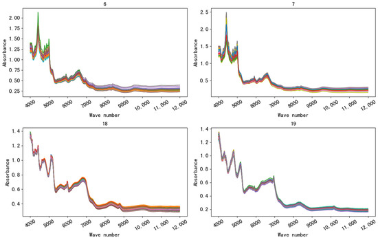 The spectra of four kinds of drugs produced by various manufacturers are shown in Figure 4. As can be seen from the figure, the spectra of the same drug produced by different manufacturers according to the Pharmacopoeia of the People’s Republic of China (2015 version II) are very similar, and the important bands (peak and valley positions) mostly overlap. Metformin hydrochloride tablets manufactured by two manufacturers (No. 6 and 7) and chlorphenamine maleate tablets manufactured by two manufacturers (No. 18 and 19) were taken from Figure 4 to form Figure 5, and the difference between manufacturers of the spectra could hardly be detected by visual inspection.