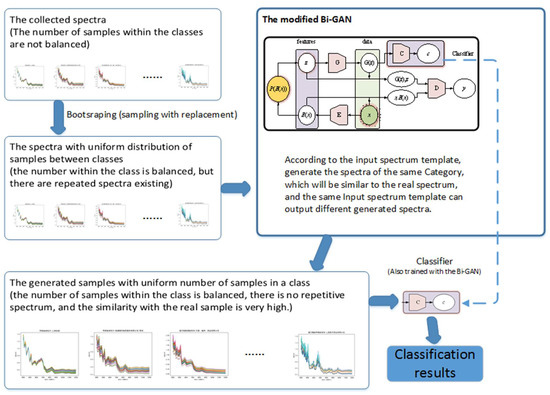 Unfortunately, in the field of near-infrared spectrum detection (including the field of drug near-infrared spectrum detection), and even in the wider field of sensor data processing, there is no relevant report on the application of GAN methods. Therefore, we can only modify an appropriate GAN method that is most suitable for the feature extraction and the generation of category samples on demand. The candidate methods are Info-GAN [46], Bi-GAN, VAE-GAN [47], etc. according to our experience and the implementation difficulties, we finally select Bi-GAN as the modification object to achieve the goal of this paper.