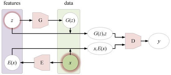In Equations (1) and (2), G is the generator, which can be regarded as the decoder. D as the discriminator and E as the encoder. x represents the real sample. E(x) represents the representation encoded into the potential space, and it is also the extracted features. z is the random sampling of the prior distribution, and G(z) represents the sample generated by z. y is the data source, if the data to be discriminated comes from the real sample x, then y = 1; if it comes from the generated sample G(z), then y = 0.
