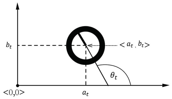 We assume there is a target moving in an indoor environment. The target’s Cartesian coordinates at time t are and is its orientation in radians, as shown in Figure 1. The target’s motion model is described by the following non-linear state-transition equation