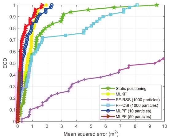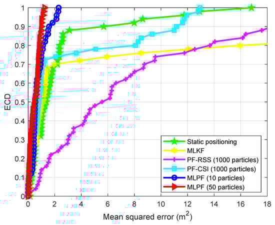 In this section, we evaluate the performance of our proposed indoor localization method. To this end, we compare it with that of two methods based on particle filtering (PF). The first one is a newly proposed RSS-based method described in [], which we refer to as PF-RSS. In order to assess the advantage resulting from using CSI measurements instead of RSS ones, the second method is the CSI-based version the PF-RSS one. It is obtained by using the PF method, described in Section 3, instead of the proposed MLPF method. We refer to it as PF-CSI. We also consider the dynamic localization method from [], which we call MLKF, and only applies to linear Gaussian motion models like the one given in Appendix B. We also consider the localization performance obtained via static localization. To this end, we use the static localization method proposed in [], which, as shown in that work, outperforms other available static positioning methods like FILA [], DeepFi [], and PhaseFi [].