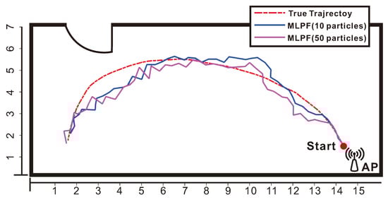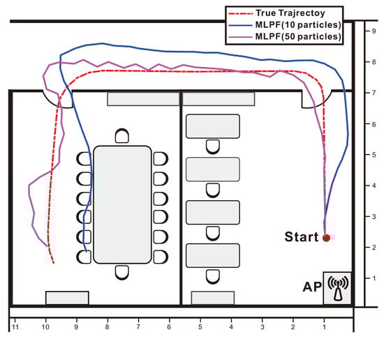 Tracking result of MLPF with 10 and 50 particles in the office rooms.